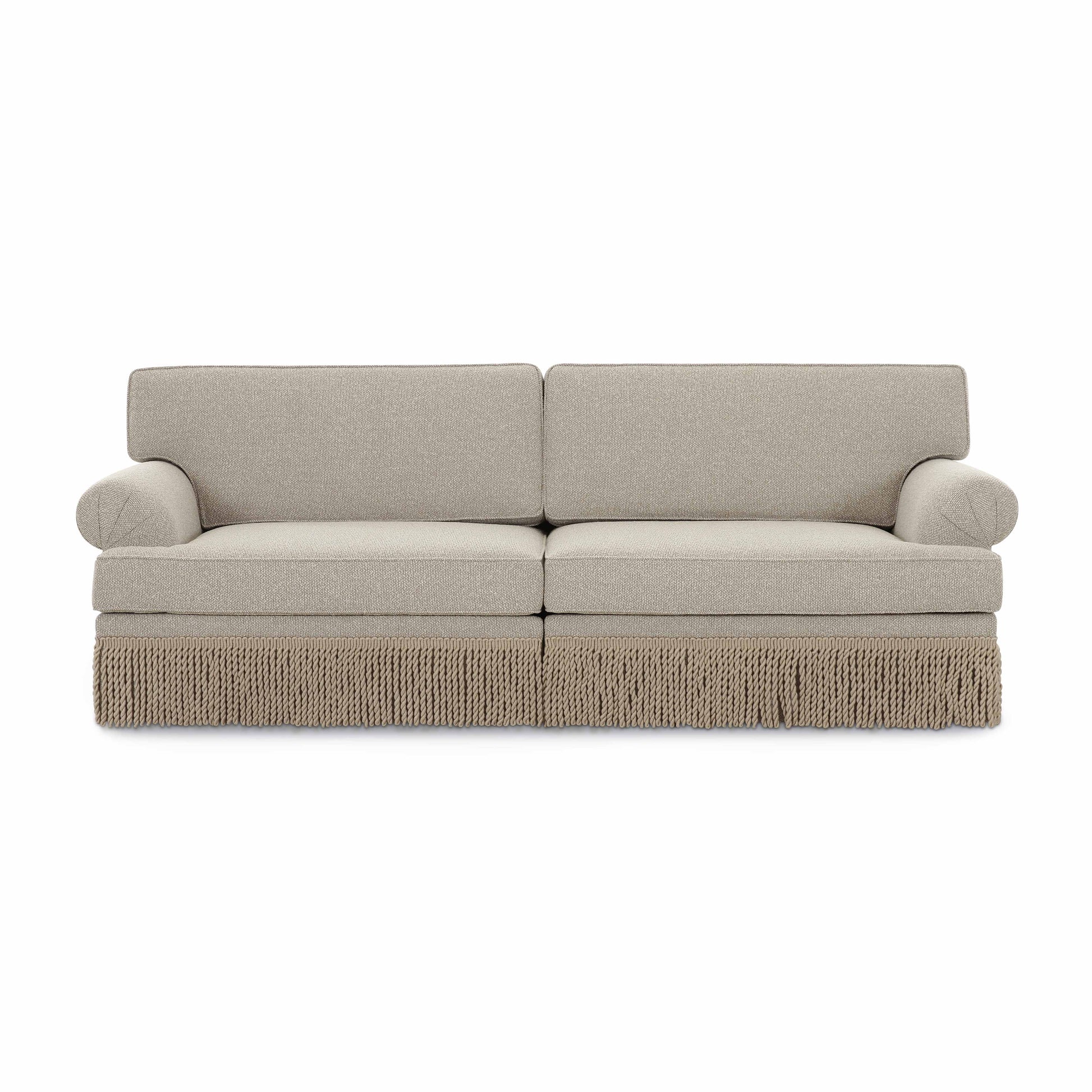 The Yvette Modular Sofa adds rich texture and a polished touch to your space with its boucle upholstery and decorative tassel fringe along the front edge. Its timeless silhouette makes it a versatile centerpiece for any living room.